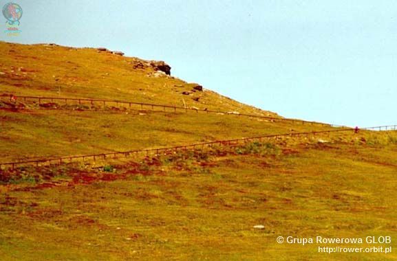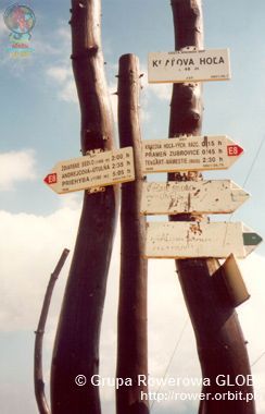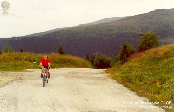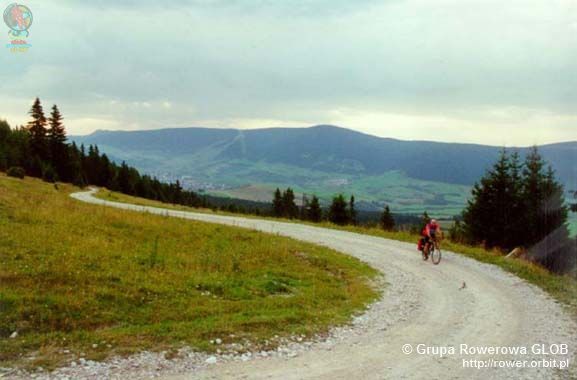 Z wioski jedziemy w dół, drogą główną na Brezno, wzdłuż linii kolejowej i rzeki Hron. Po 6 km mijamy budynek przystanku Czerwona Skała (C ervena Skala) a po dalszych 2 km skręcamy w górę do wioski Szumiac (©umiac), ostatniej osady u podnóża południowej strony Kralowej Hali. Wzdłuż potoku, waską smołowana drogą z centrum zaczyna się stromy podjazd (oznakowany tablicami szlaku rowerowego i niebieskimi pieszego). Powyżej ostatnich zabudowań droga skręca ostro - o 180° - w prawo, a nawierzchnia staje się gruntowa, bardzo kamienista. Dalej dość łagodnymi trawersami przecina łąki na stokach. Widoki na okolicę stają się coraz rozleglejsze aż do miejsca, w którym droga nie wejdzie w gęsty las. Po kilku kilometrach na wys. ok. 1400 m las rzednie, a na wprost otwiera się widok na sam szczyt i stojacą na nim wieżę. Kilkaset metrów dalej droga skręca w prawo na przełęcz Predne sedlo (1452 m npm) i odtąd - ku zaskoczeniu jadącego - jej nawierzchnia staje się asfaltowa! Nie jest to co prawda nowy asfalt, ale ten sprzed 40 lat miejscami posmarowany świeżą smołą. Choć nachylenie podjazdu znów rośnie a drogę po bokach porastają krzewy to odtąd jedzie się już dużo łatwiej. Na wysokości 1600 m npm kończy się zasięg lasu, droga wkracza w piętro hal a widoki stają się nieograniczone. Można tu także nabrać krystalicznie czystej wody ze źródełka tuż przy drodze, jedynego takiego miejsca na całym podjeździe.